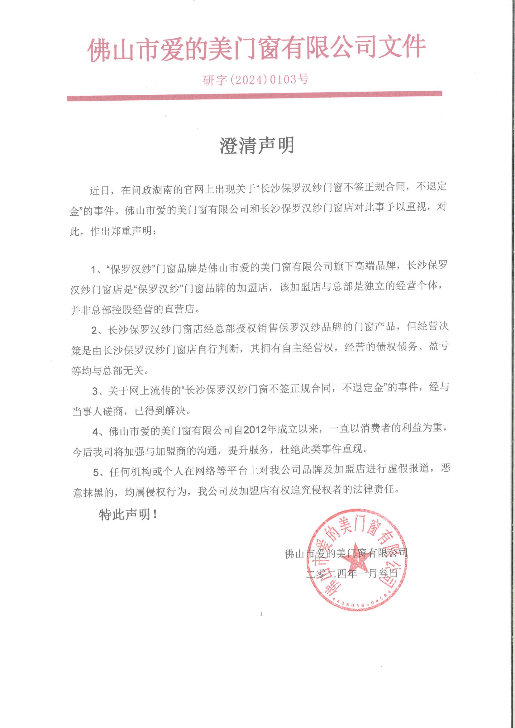 保羅漢紗門窗澄清聲明