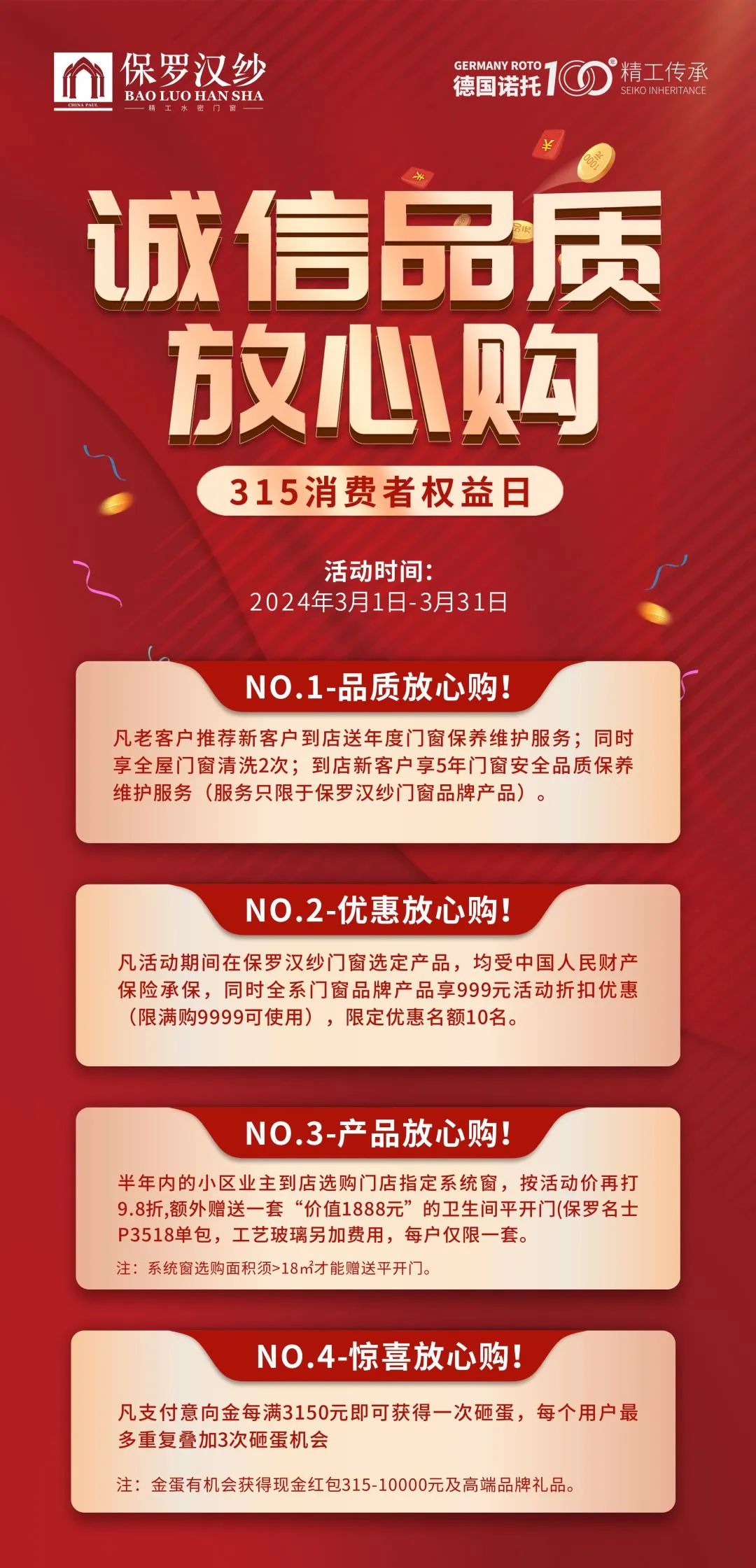 質(zhì)惠雙享,買窗無憂,3月1日—3月31日,保羅漢紗門窗重磅開啟全國聯(lián)動(dòng)大促,推出“品質(zhì)放心購、優(yōu)惠放心購、產(chǎn)品放心購、驚喜放心購”等超多驚喜優(yōu)惠,一站定制全屋門窗,讓您省心更省薪,全國300+品牌專賣店期待您的光臨~