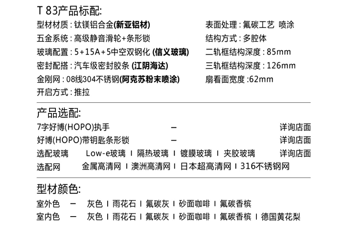 標(biāo)配: 0.7絲304金剛網(wǎng);選配0.6-0.8絲304金剛網(wǎng),可做擋水軌,低軌,走銅條;標(biāo)配五金配件:保羅漢紗條形鎖、重型不銹鋼尼龍輪、不銹鋼防擺輪;選配: D形拉手、雙勾鎖體、可做豪華緩沖門 |